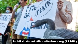 Як повідомляє кореспондент Радіо Свобода, в акції взяли участь близько 20 людей, вони тримали плакати і фігури гусей, акція пройшла мирно.