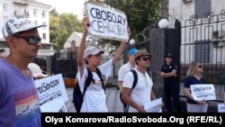 Посольство Росії в Києві 21 серпня, у сотий день голодування в російській колонії українського режисера Олега Сенцова, пікетують із вимогою до Москви відпустити українця.