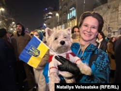«Це наш спільний біль. Хочу сказати українцям, що вони не самі в цій війні», – каже молода білоруска з синьо-жовтим прапорцем і песиком на руках.
