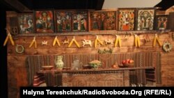 В експозиції виставки також представлено інтер’єр старої гуцульської хати на Різдво. На стіні навпроти вхідних дверей гуцули розташовували хатні ікони, вивішували сирні коники, кукурудзяні качани.