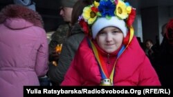 На урочисту зустріч вогню під будівлею міської ради зібралось близько сотні людей, зокрема ветерани антитерористичної операції проти спільних російсько-сепаратистських сил на окупованій частині Донбасу.
