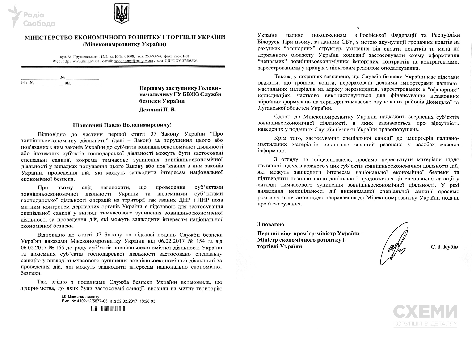 Кубів у листі зазначив, що «застосування спеціальної санкції до імпортерів паливно-мастильних матеріалів викликало значний резонанс у засобах масової інформації». 23 лютого СБУ запропонувала міністерстві скасувати санкції.