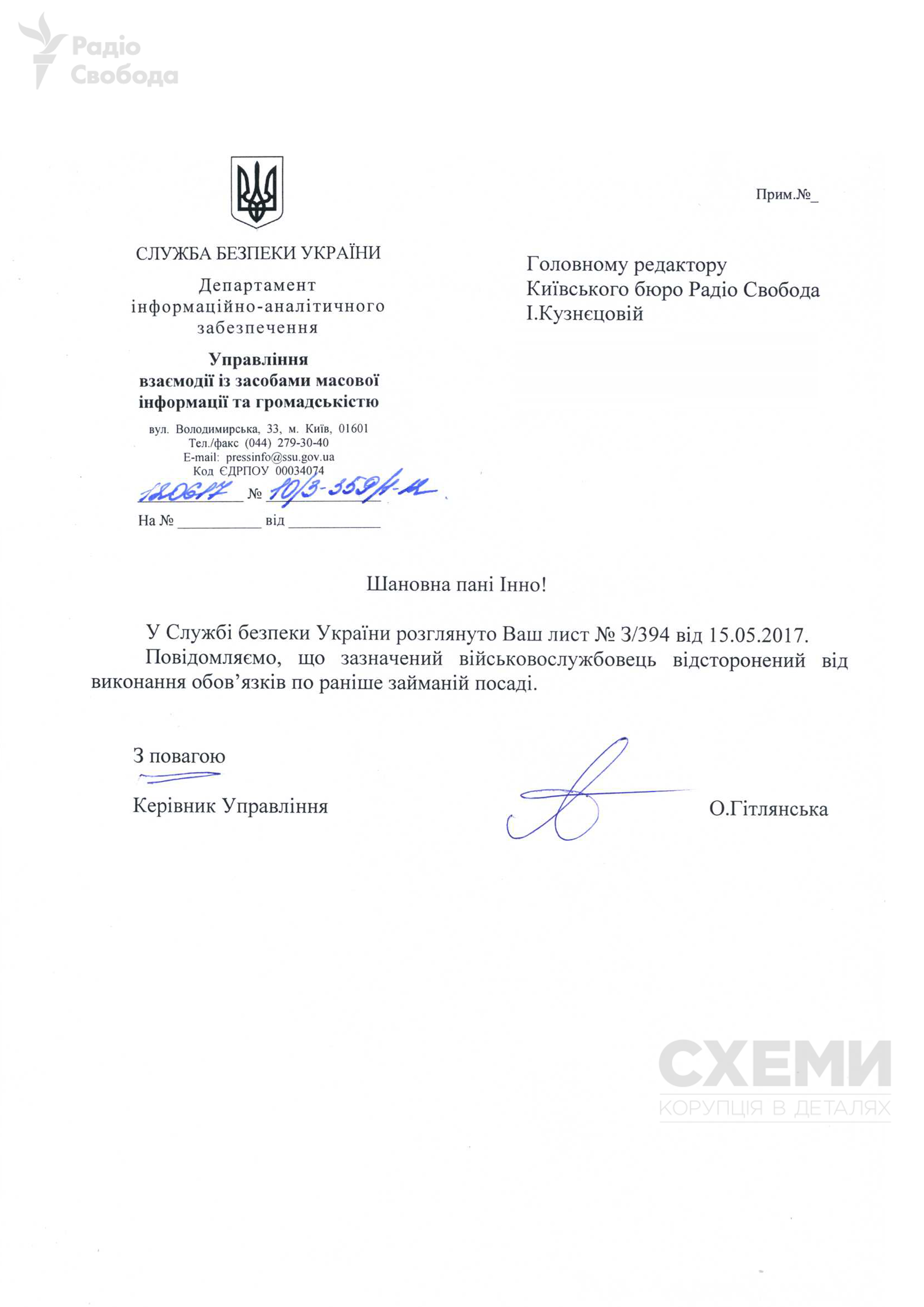 Журналісти програми «Схеми» (спільний проект Радіо Свобода та телеканалу «UA:Перший») поцікавилися в СБУ, чи усунений з посади або звільнений співробітник Департаменту захисту національної державності Роман Матковський, та чи пов’язане таке рішення з його участю у подіях 9 квітня.