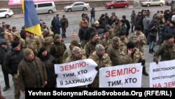 У Києві біля будівлі Кабміну близько ста активістів та учасників бойових дій на Донбасі протестували з вимогою спрощення механізму надання землі ветеранам української воєнної операції на Донбасі.