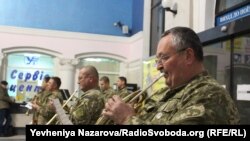 Як повідомляє кореспондент Радіо Свобода, о 17:00 на центральному залізничному вокзалі міста військові музиканти виконали низку музичних композицій і гімн України.
