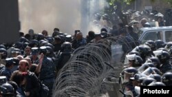 Як повідомляє Вірменська служба Радіо Свобода, поліція розтягла колючий дріт і застосувала спецзасоби, ймовірно, шумові гранати, щоб не пропустити учасників протесту до будівлі парламенту.
