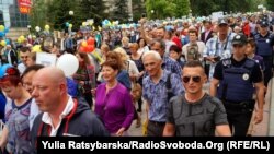 Колони «Опозиційного блоку» та «радянських офіцерів» зустрічали активісти з проукраїнськими гаслами, а також учасники бойових дій на Донбасі з плакатом «Зламали хребет Гітлеру, зламаємо і Путіну». Далі словесних перепалок не зайшло.