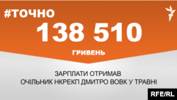 Голова Національної комісії, що здійснює державне регулювання у сферах енергетики і комунальних послуг Дмитро Вовк у травні отримав 138 510 гривень зарплати. Така інформація міститься в Єдиному державному реєстрі декларацій осіб, уповноважених на виконання функцій держави або місцевого самоврядування, повідомляє #Точно, проект Радіо Свобода.
