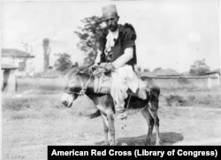 «Подорож Балканами в стилі люкс. Це популярний метод подорожування в Албанії, де гора йде за горою з приголомшливою швидкістю. Цей албанський верховинець переважує свого віслюка в усьому, крім хіба що сили й упертості. Це фото було зроблене біля диспансеру (Червоного Хреста) у Скутарі [нині Шкодер – ред.], до якого вершник приїхав, щоб отримати допомогу після укусу змії по тому, як він без успіху намагався вилікувати себе сам популярним методом прикладання павутини і тютюнового відвару».