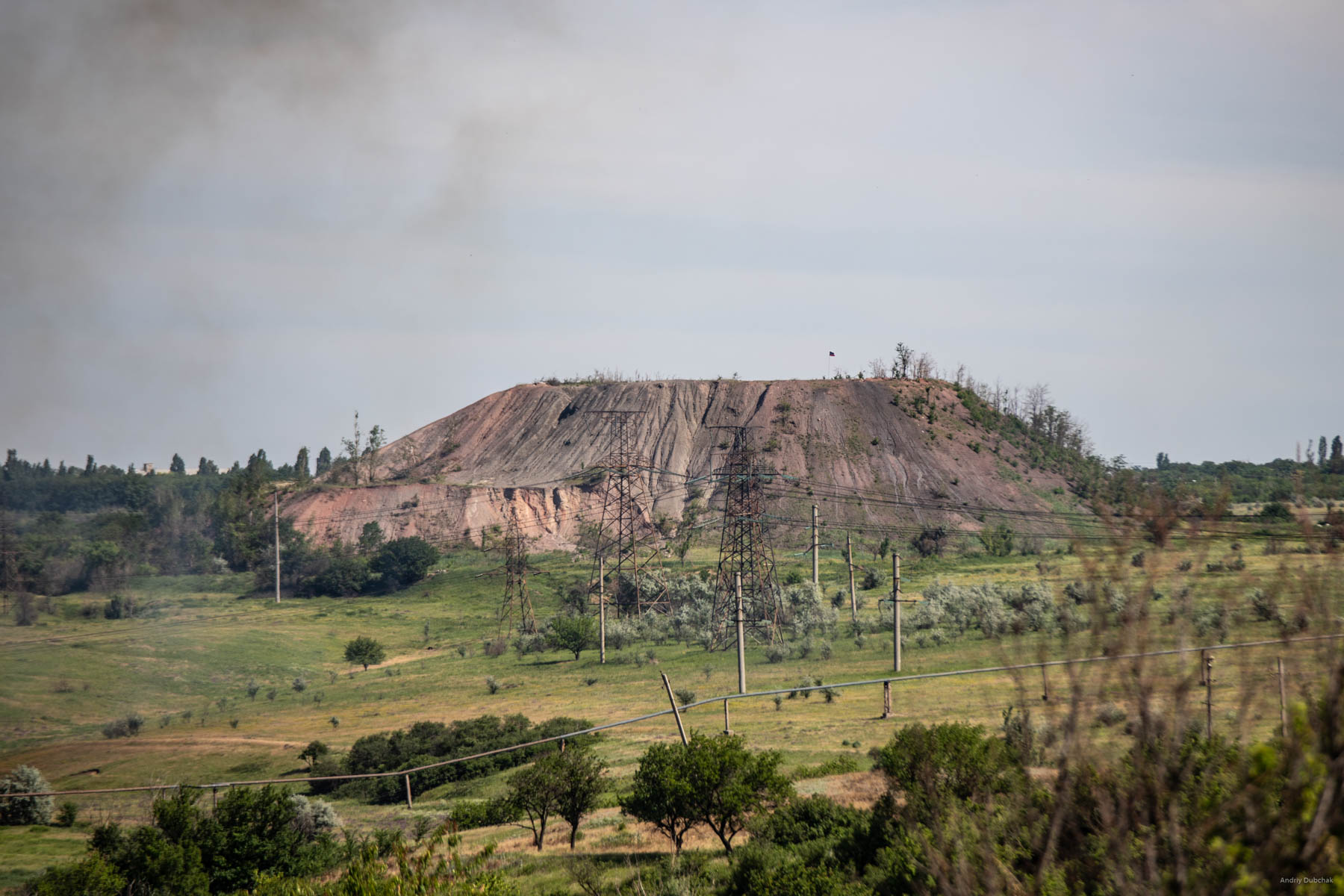 Терикон, на якому розташовані вогневі точки підтримуваних Росією бойовиків. Саме з ними точився позиційний бій. Над укріпленнями нагорі – прапор із символікою угруповання «ДНР». Зліва на фото – дим від палаючих хат у Південному.