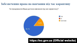 Опитування серед більш ніж 8 тисяч батьків про навчання їхніх дітей під час карантину, яке провела у квітні цього року служба освітнього омбудсмена, показало, що основними проблемами виявилися організаційні (відсутність єдиного ресурсу для проведення онлайн-уроків, неузгодженість розкладу занять), психологічні (відсутність мотивації до навчання, невміння працювати самостійно), а також технічні проблеми (погана якість інтернету або ж його відсутність, застарілість комп’ютерного обладнання і програмного забезпечення). 5,6% респондентів відповіли, що їхні діти взагалі не навчалися в період карантину.