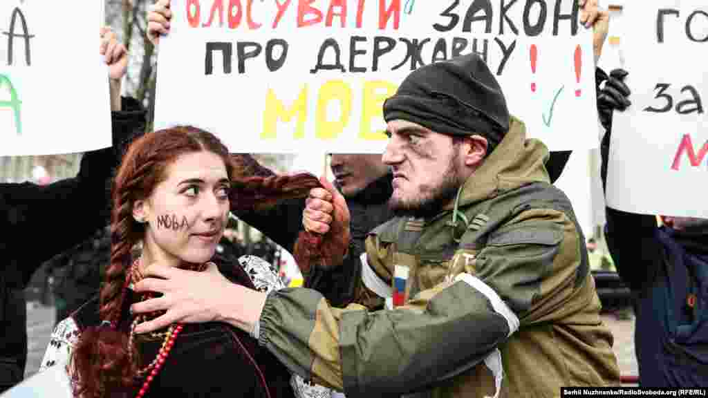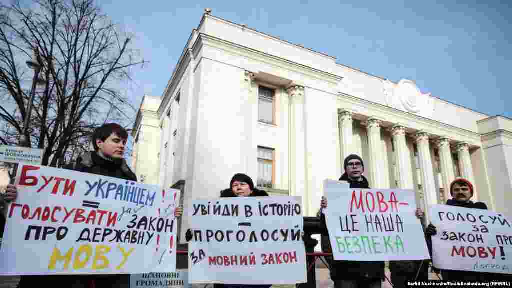 Декілька десятків громадських активістів провели акцію під будівлею Верховної Ради з вимогою підтримати законопроект № 5670-д «про забезпечення функціонування української мови як державної». Активісти тримали плакати на підтримку української мови. Вони зустрічали народних депутатів, роздавали їм листівки із закликом ухвалити законопроект. Під будівлю парламенту прийшли не тільки активісти-прибічники закону – частина грала роль тих, хто будь-що прагне цей закон провалити, – «російських окупантів». Також персонажем акції була Мова – жертва російських окупантів і водночас головна зброя проти них.