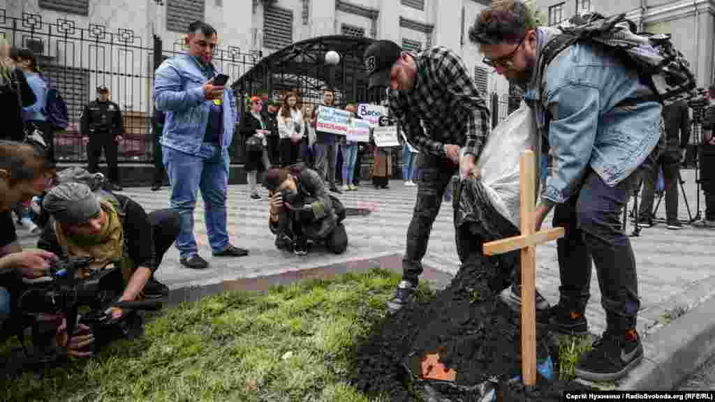 Під час акції присутнім під посольством розповіли історії українських військовополонених і заручників Кремля. По закінченню акції активісти поховали в «могилі» біля посольства РФ іграшковий автобус, літаки ІЛ 76 та МН 17 та інші символи, що символізують злочини, здійснені терористами на Донбасі.