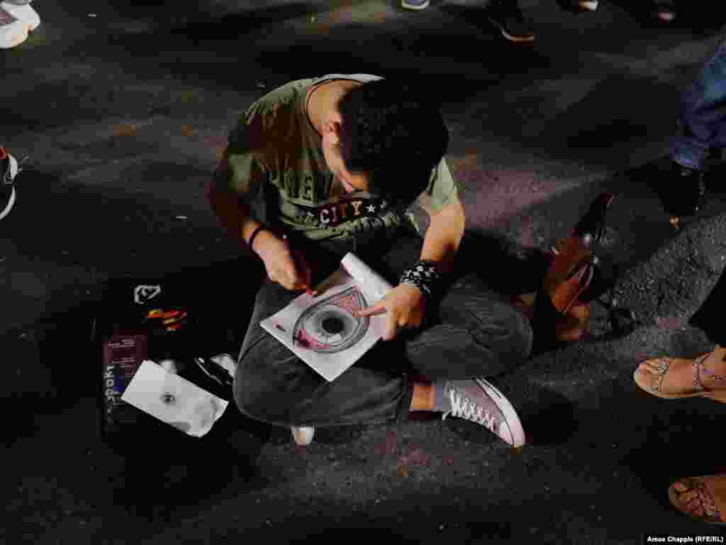 Дівчата з пов’язками на очах, що символізують протестувальників, поранених, як повідомлялося, гумовими кулями поліції під час протестів 20 червня