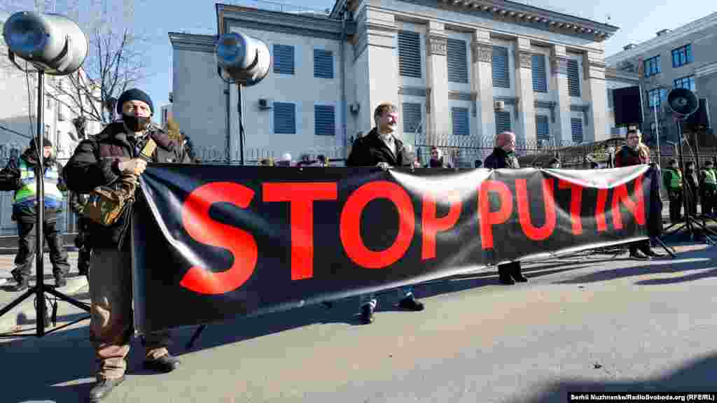 У Києві 22 лютого декілька сотень людей влаштували акцію протесту під російським посольством на тлі «визнання Росією незалежності ДНР і ЛНР»