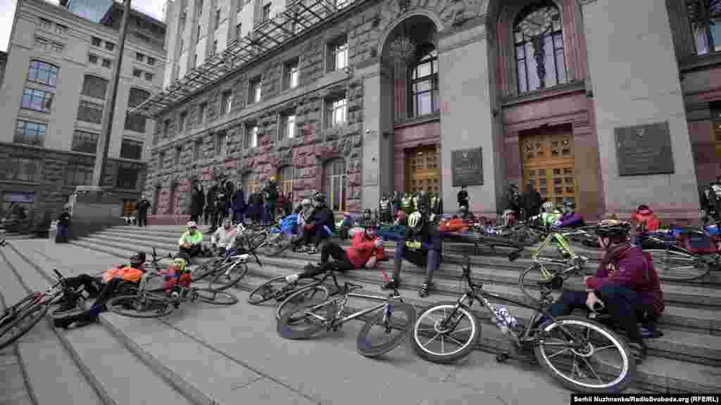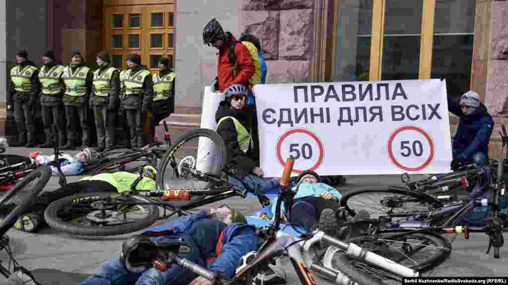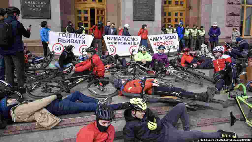 14 березня десятки велосипедистів влаштували «лежачий» протест біля Київської міської державної адміністрації. Акція пов'язана зі смертю літнього чоловіка, якого 28 лютого збив автомобіль на велопереїзді в столиці (проспект Бажана), а також інші ДТП, де постраждали велосипедисти. Учасники протесту вважають, що в смерті людини є вина чиновників мерії Києва, які саботують розвиток велосипедної мережі міста і паралельно ухвалюють рішення щодо підвищення швидкості на магістральних вулицях до 80 км/год.
