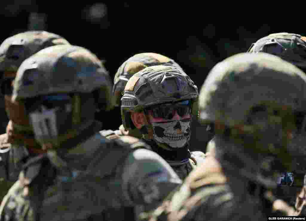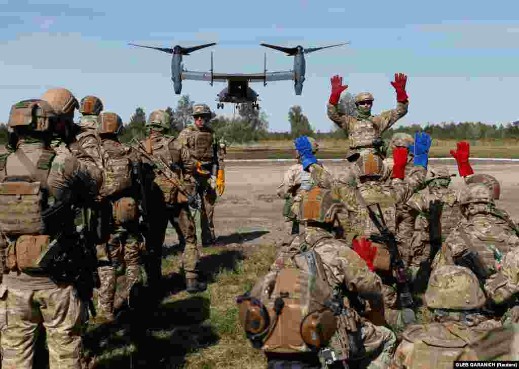 радників і спостерігачів від США, Великої Британії, Німеччини, Литви та Польщі, а також понад 100 військових частин та підрозділів усіх видів військ Збройних сил, близько 12 тисяч людей та 700 одиниць техніки. Одночасно з ними відбуваються на Яворівському полігоні у Львівській області навчання Rapid Trident-2020. ЗСУ, військові США, Німеччини, Данії, Румунії, Литви, Польщі, Канади та Великої Британії – загалом близько 4000 осіб – взяли участь у цих тренуваннях. Залучені конвертоплани США, колісна та гусенична військова техніка, армійська авіація Сухопутних військ та авіація Повітряних сил України. (Фото: Офіс президента, Reuters, RFE/RL: Сергій Нужненко).