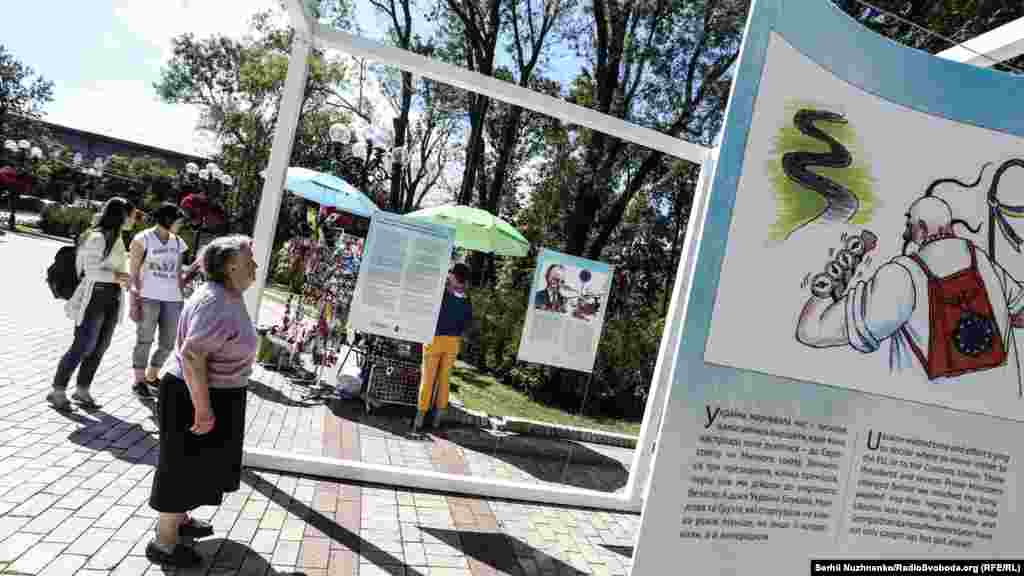9 червня у столичному парку імені Тараса Шевченка відкрили виставку карикатур «Шлях України до безвізового режиму з ЄС». Відомі художники підготували 18 малюнків, на яких з гумором показали киянам та гостям міста про успішні кроки повернення України до Європи.