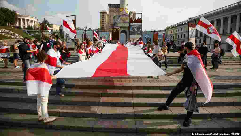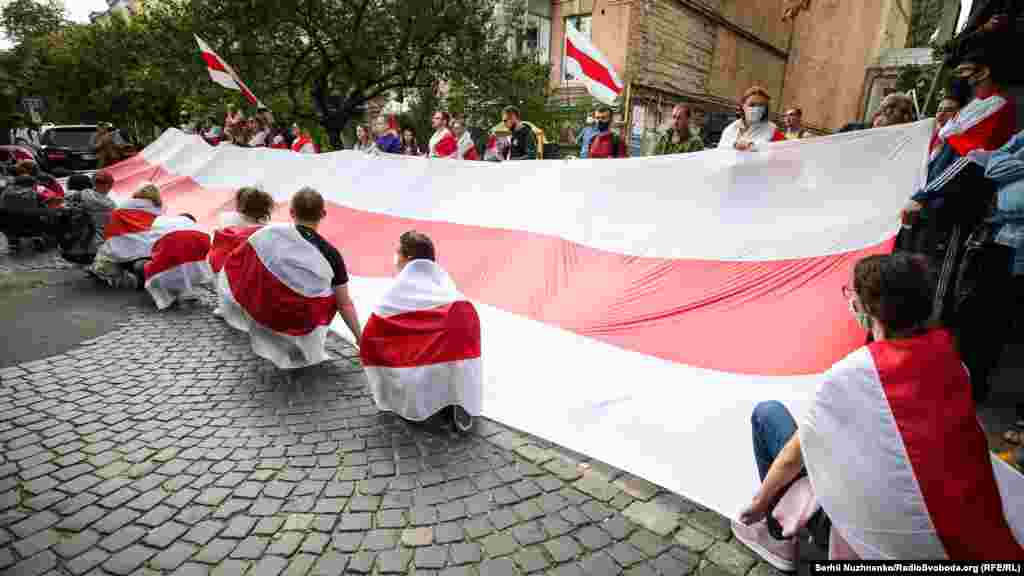 Близько сотні людей зібралися 4 жовтня на майдані Незалежності в Києві. З біло-червоно-білими прапорами вони пройшли від майдану центром міста до будівлі посольства Білорусі. Учасники акції скандували: «Живе Білорусь!», «Сашу в автозак» та інші гасла.