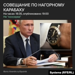 Того ж дня в тому ж кабінеті Путін провів ще два заходи по відеозв’язку – саміт АТЕС і нараду щодо ситуації в Нагірному Карабаху. На них годинник Путіна показує правильний час, що збігається з метаданими зйомки.
