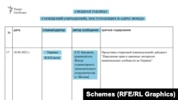 У звіті фонду про його роботу, який «Схеми» розшукали у витоку, є розділ – «Український напрямок». У ньому детально описується робота, яку «Правфонд» веде на території України. Наприклад, функціонування в Києві «Центру правових консультацій», адвокати якого вели прийом громадян, а сам центр готував звіти для російської влади про «воєнні злочини ЗСУ» та «порушення прав російськомовного населення».