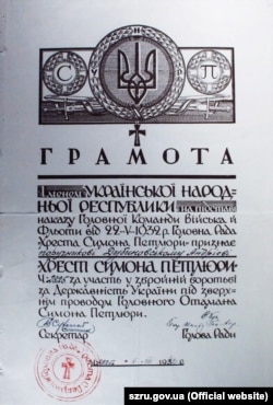 Серед відтисків печаток є такий напис: «Головна Рада Хреста С. Петлюри», на якому в центральній частині зображено не тризуб, а саме Хрест Симона Петлюри. Це нагорода, яка була затверджена у 1932 році і надавалася учасникам визвольних змагань. А проєкт нагороди зробив відомий український геральдист Микола Битинський.