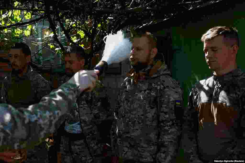 Військовий капелан Олександр Карапетян окроплює свяченою водою військовослужбовців 93-ї окремої механізованої бригади «Холодний Яр» під час Великодного богослужіння поблизу лінії фронту. Донецька область, 5 травня 2024 року