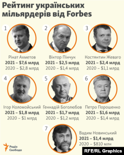 Українське видання журналу Forbes оновило рейтинг мільярдерів України. І з’ясувало: статки більшості українських олігархів значно зросли за минулий рік – у час, коли, за даними Офісу президента України, Володимир Зеленський здійснював деолігархізацію.