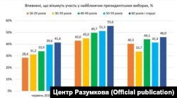 Однак опитування зафіксувало й інший, не менш важливий вимір електорального поділу, а саме віковий. Серед усіх виборців віком до 30 років прийти й проголосувати за Зеленського готові понад 37%, в той час як політики «старої формації» (насамперед, Бойко та Тимошенко) мають низьку підтримку серед молоді, але лідирують за популярністю серед виборців найстаршого віку.