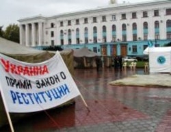 Учасники акції протесту вимагають від центральної влади України об’єктивного розслідування фактів побиття правоохоронцями репатріантів під час ліквідації на плато Ай-Петрі їхніх торгових об’єктів.